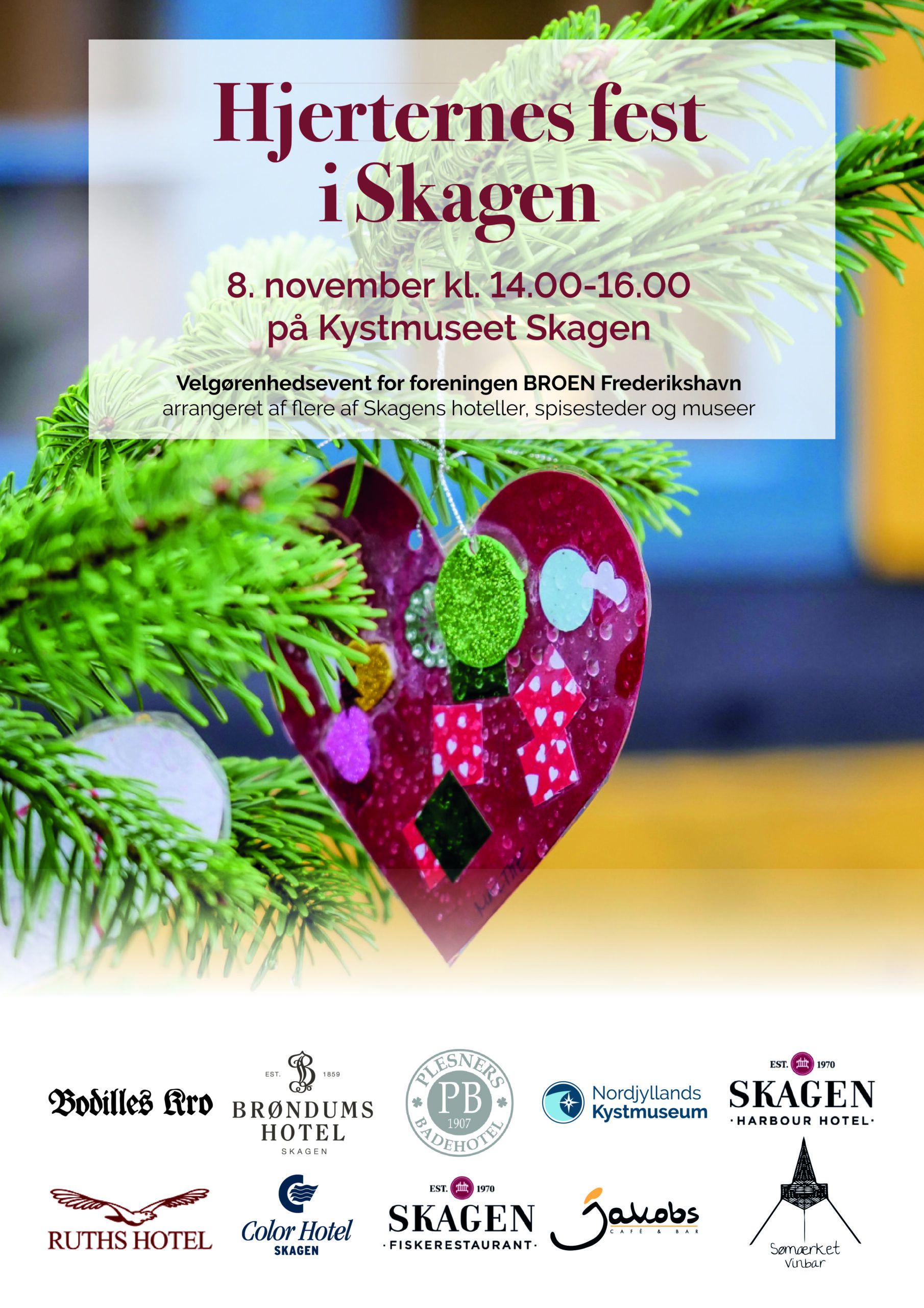 Derfor vil flere af Skagens kendte hoteller, spisesteder samt Kystmuseet Skagen igen i år bidrage til juleeventet Hjerternes Fest i Skagen, hvor alle indtægter i år går ubeskåret til BROEN Frederikshavn.